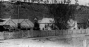 The original convent (left) and St Patrick's Church (right) behind tree at Picton